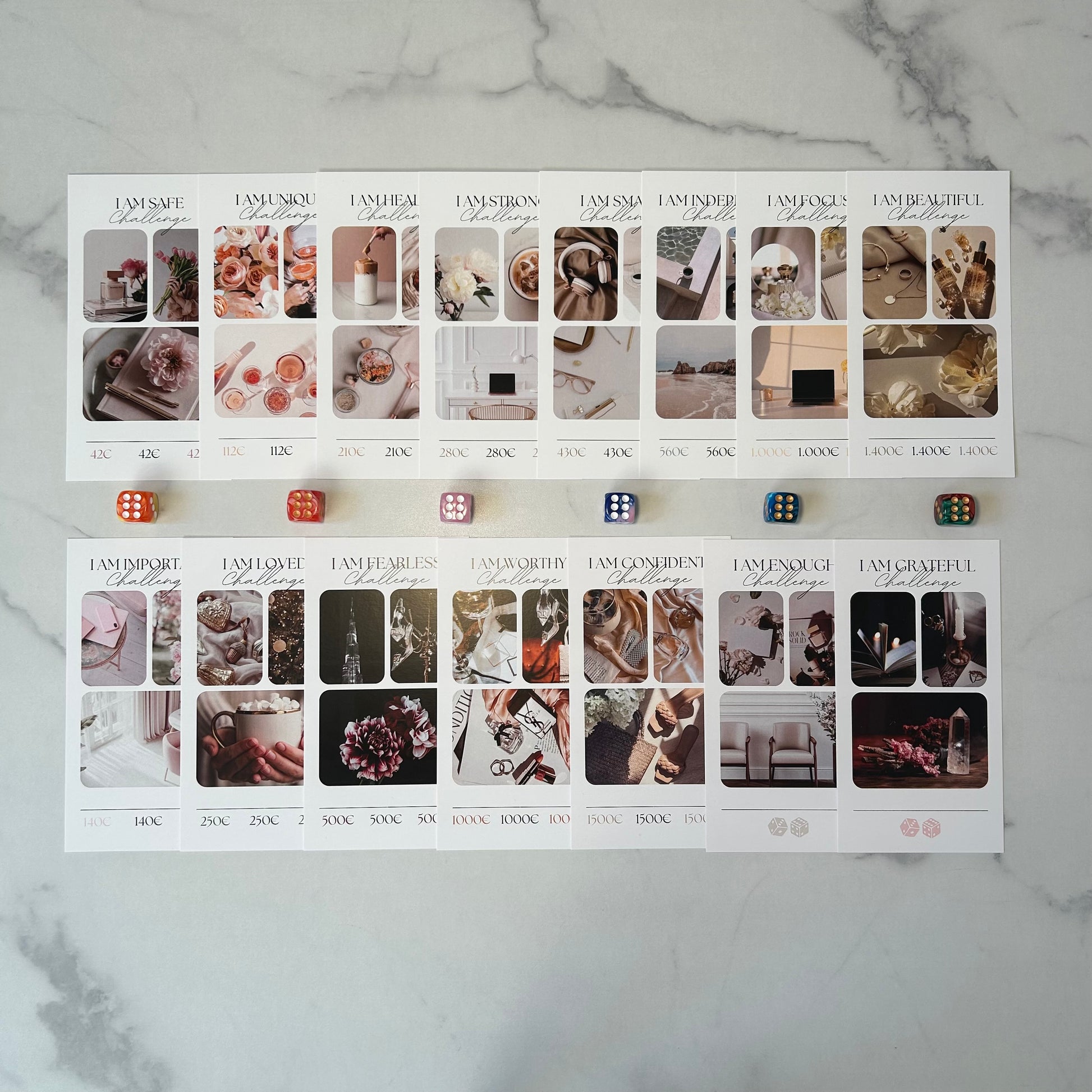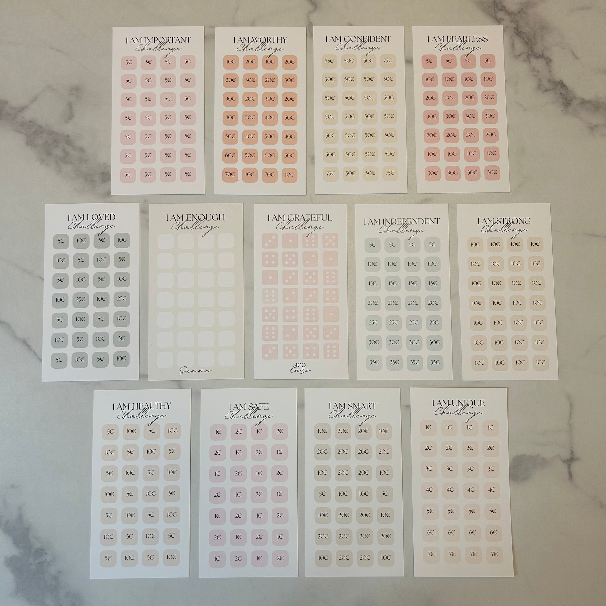 Das Affirmations-Sparchallenge-Bundle kombiniert effektives Sparen mit mentaler Unterstützung. Jede Challenge ist mit einer positiven Affirmation versehen, die dich motiviert und deinen Fokus auf deine finanziellen Ziele stärkt. Exklusiv im Bundle: Eine Challenge ist nur hier oder in ausgewählten Specials nicht im Einzelverkauf verfügbar. Zusätzlich erhältst du einen der abgebildeten Würfel, da sich im Bundle zwei Würfelchallenges befinden.